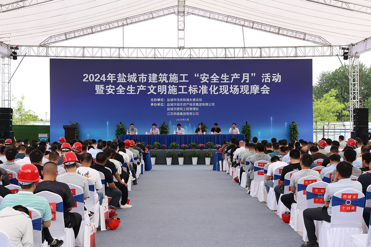 揚(yáng)建網(wǎng)訊 6月25日,鹽城市住房和城鄉(xiāng)建設(shè)局在江蘇揚(yáng)建集團(tuán)有限公司承建的鹽城市第四人民醫(yī)院異地新建工程召開了2024年度鹽城市建筑施工“安全生產(chǎn)月”活動(dòng)暨安全生產(chǎn)文明施工標(biāo)準(zhǔn)化現(xiàn)場(chǎng)觀摩會(huì)。鹽城市住建局、鹽城市城投集團(tuán)、鹽城市各區(qū)縣住建局等各級(jí)領(lǐng)導(dǎo),以及全市各建筑監(jiān)督機(jī)構(gòu)、各在建項(xiàng)目主要負(fù)責(zé)人共400余人參加了觀摩。