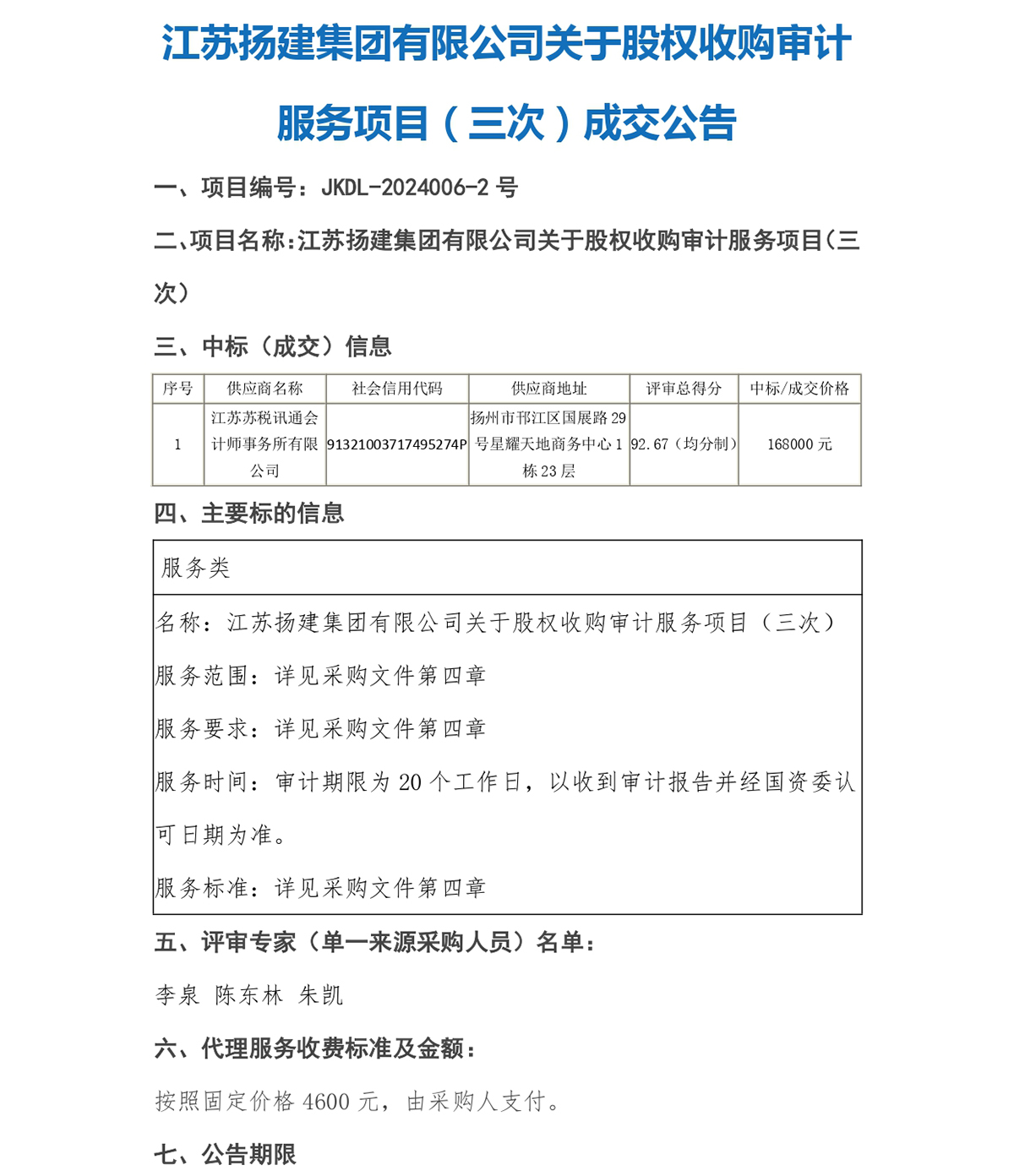 江蘇揚(yáng)建集團(tuán)有限公司關(guān)于股權(quán)收購審計(jì)服務(wù)項(xiàng)目(三次)成交公告