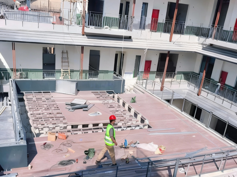 主體結構加固是場硬仗。團隊針對磚混、框架、鋼結構等不同類型建筑,制定差異化方案:磚混建筑采用加大截面、碳布加固等方式,保留原有結構形態(tài);框架建筑新增混凝土柱,部分構件包鋼處理;老城區(qū)安裝施工升降機提高了運輸效率,P#樓屋面還采用樓承板設計,兼顧安全與功能。